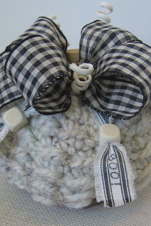 This is an upcycled piece that is a combination of a thrift store find and my craft stash. I found the knitted pumpkin, which is in colors of White with tiny Black threads, and embellished it with a Black and Cream Gingham plaid wired ribbon Bow, some Black and White Ticking fabric stripes and some curled paper wrapped wire Pumpkin Tendrils. I also added a wood stem to the top and a painted and sealed wood slice to the bottom to add a sturdy base. Please note the white wood beads and the hand stamped BOO! on the ticking stripes.