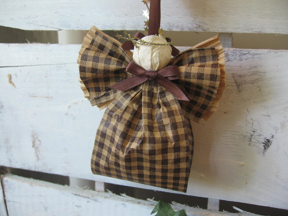 Primitive Brown and Tan Plaid Hanging Angel Ornament