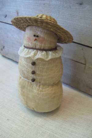 Primitive Handmade Plush Snowman Gal. I have made this small sized decoration from a scrap from a vintage mattress pad which I coffee stained. I then embellished her with a straw hat, jute twine and lace, and rusty bells for her buttons. She has bead eyes, a carrot nose and don't miss her black boots peeking out.