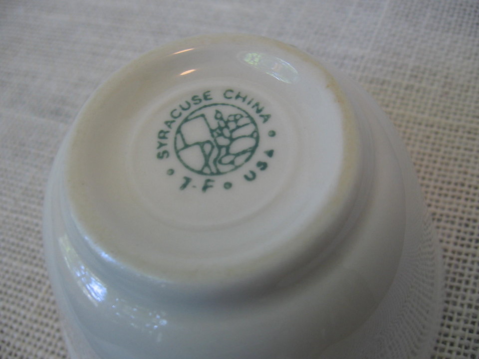 Perfect piece of Restaurant Ware from Syracuse China to add to you rustic farmhouse kitchen. This small size bowl is a perfect cup of soup, condiment, fruit or dessert bowl. It is an off white in color with a golden Yellow circle around the top edge and two rows of scallops around the top and lower edges of the bowl.